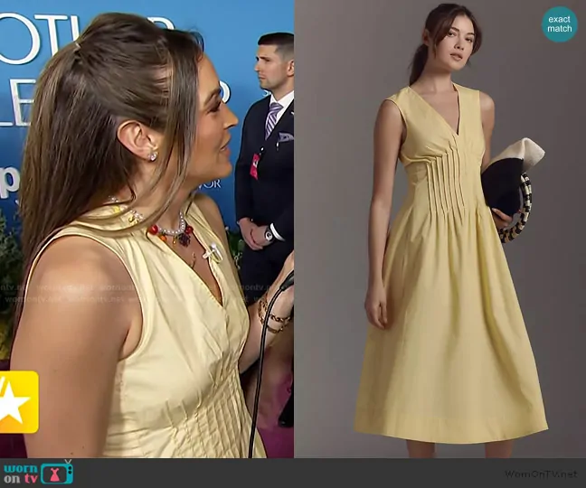 Emily Orozco on Access Hollywood on NBC was spotted wearing this yellow pleated dress on Access Hollywood on Apr 29 2025's episode. Emily's Dress is the The Hailey Sleeveless V-Neck Pintuck Midi Dress by Maeve.