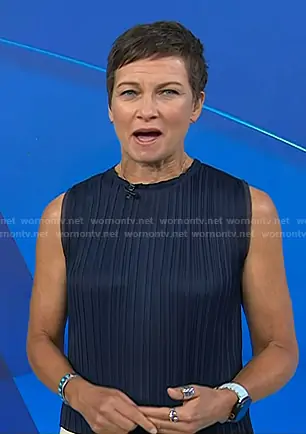 Stephanie Gosk on Today on NBC was spotted wearing this navy pleated sleeveless top on Today on Sep 03 2025's episode. Stephanie's Top is the Pleated Crewneck Top in Coastal Blue by Vince.