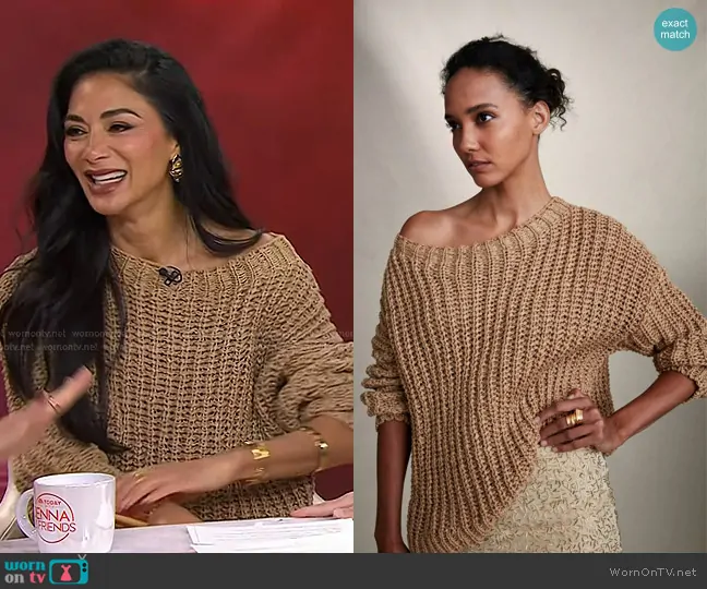 on Today on NBC was spotted wearing this brown off-shoulder knit sweater and skirt on Today on May 01 2025's episode. 's Sweater is the Spring 2025 Collection by Donna Karan New York . 's Skirt is the Spring 2025 Collection by Donna Karan New York . 's EArrings is the Crumpled Gold Small Post Earrings by Alexis Bittar.