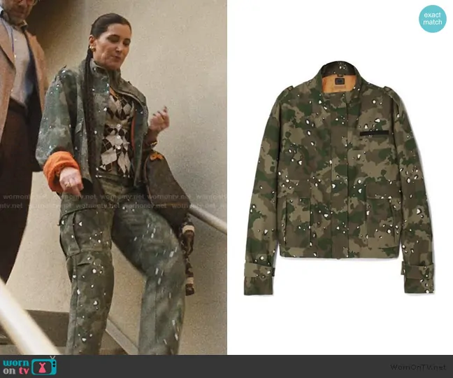 Maya Mason (played by Kathryn Hahn) on The Studio on Apple TV was spotted wearing this camo print jacket and pants on The Studio on episode 'The Note' (1x03) in Apr 2025. Maya's Jacket is the Molly Cotton-canvas Jacket In Army Green by Kith . Maya's Pants is the Military Line Canvas Pants in Army Green by Kith.