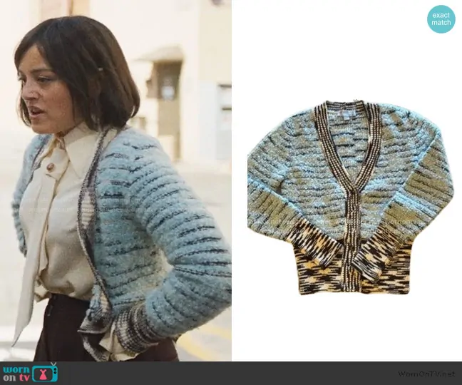 Quinn Hackett (played by Chase Sui Wonders) on The Studio on Apple TV was spotted wearing this blue marled cardigan on The Studio on episode 'The War' (1x05) in Apr 2025. Quinn's Sweater is the Striped Cardigan by Missoni.