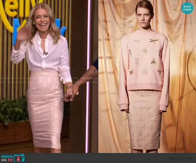Kelly Ripa on Live with Kelly and Mark on Disney ABC Home Entertainment was spotted wearing this metallic floral skirt on Live with Kelly and Mark on May 12 2025's episode. Kelly's Skirt is the 2014 Collection by Emma Cook.