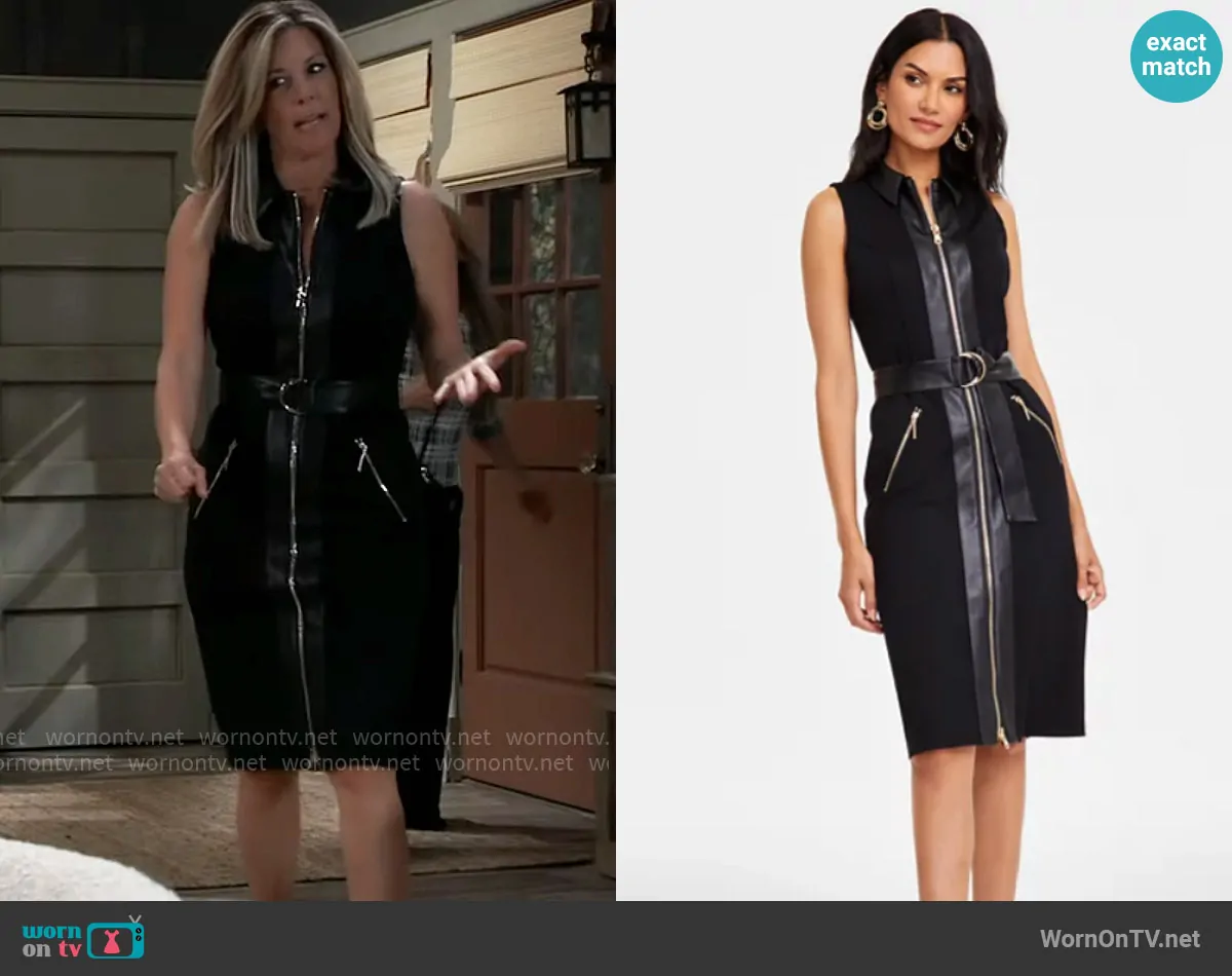 Carly Spencer (played by Laura Wright) on General Hospital on ABC was spotted wearing this black zip front dress with leather details on General Hospital on May 12 2025's episode. Carly's Dress is the Belted Mixed-Media Dress by INC International Concepts .