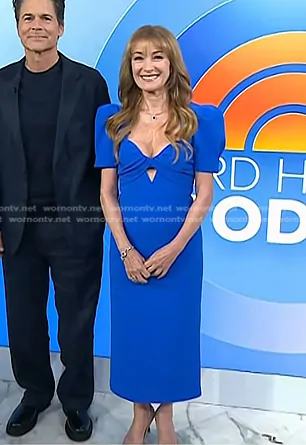 on Today on NBC was spotted wearing this blue puff sleeve dress on Today on May 12 2025's episode. 's Dress is the Antonella Puff-Sleeve Sweetheart Midi Dress by Rebecca Vallance.