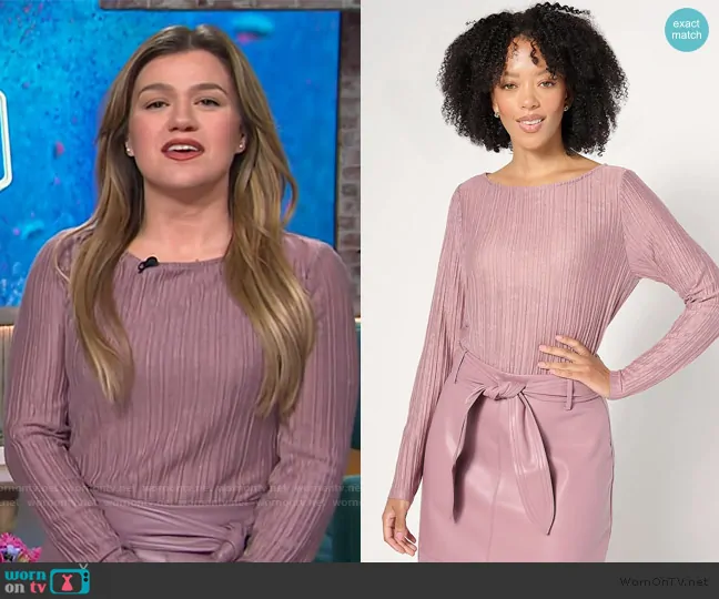 Kelly Clarkson on The Kelly Clarkson Show on NBC was spotted wearing this pink ribbed top on The Kelly Clarkson Show on May 12 2025's episode. Kelly's Top is the Boatneck 3/4 Sleeve Top by Beautiful by Lawrence Zarian . Kelly's Skirt is the Zarian Petite Faux Leather Self Belt Skirt by Lawrence Zarian.