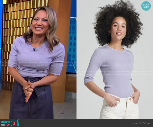 Ginger Zee on Good Morning America on ABC was spotted wearing this Ginger’s lilac ribbed top and leather skirt on Good Morning America on May 13 2025's episode. Ginger's Top is the Quarter Sleeve Ribbed Top by Naadam . Ginger's Skirt is the Greenwich Skirt by Marie Oliver.