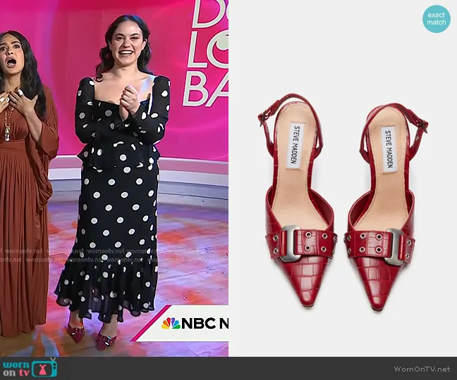 Donna Farizan on Today on NBC was spotted wearing this red buckle slingback pumps on Today on May 13 2025's episode. Donna's Shoes is the Dillon Buckle Faux Leather Slingback Heels in red croco by Steve Madden.