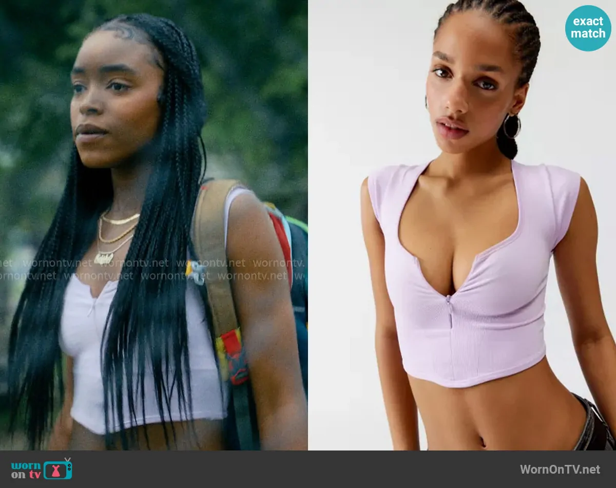 Keisha Clark (played by Lovie Simone) on Forever on Netflix was spotted wearing this purple crop top and ivory pants on Forever on episode 'The Vineyard' (1x05) in May 2025. Keisha's Top is the Camilla Zip Cropped Baby Tee by Out From Under at Urban Outfitters . Keisha's Pants is the Charlie Cargo Pant by BDG at Urban Outfitters . Keisha's Shoes is the Air Jordan 1 Zoom Air CMFT 2 Yellow Ochre/Tour Yellow-Pale Vanilla-Safety sneakers by Jordan.