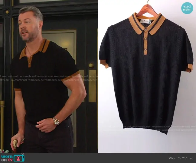 EJ DiMera (played by Dan Feuerriegel) on Days of our Lives on Peacock was spotted wearing this black contrast collar knit polo on Days of our Lives on May 16 2025's episode. 's Shirt is the Knit Polo Shirt by Irish Crone.