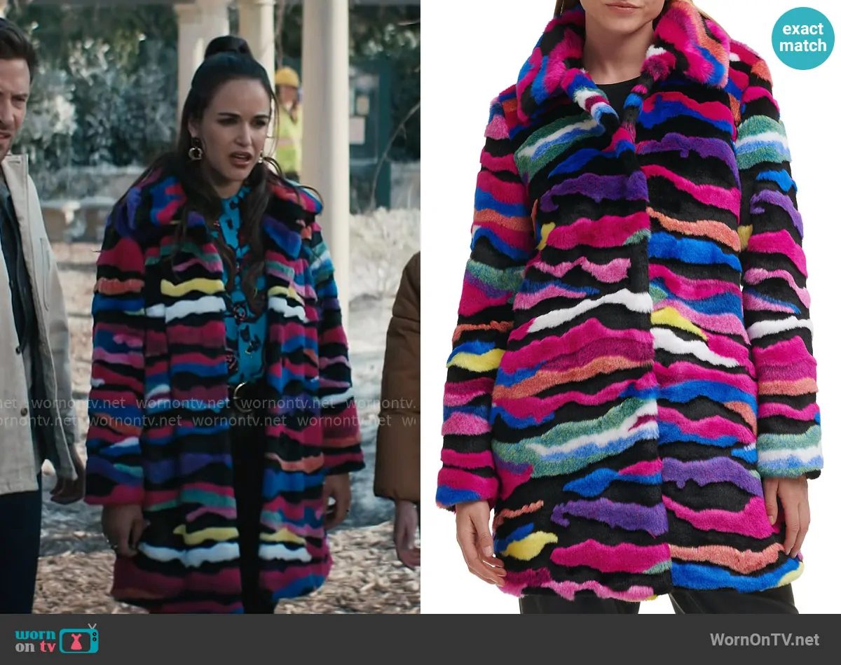 Birdie (played by Melissa Fumero) on Grosse Pointe Garden Society on NBC was spotted wearing this multi color stripe fur coat on Grosse Pointe Garden Society on episode 'Bad Seeds' (1x13) in May 2025. Birdie's Coat is the Multicolor Faux Fur Coat by Karl Lagerfeld Paris.