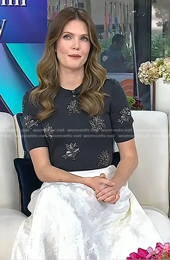 on Today on NBC was spotted wearing this grey embellished sweater and white skirt on Today on May 19 2025's episode. 's Dress is the Wool Dress with Embroideries in Black by Fendi . 's Skirt is the FF silk skirt in White by Fendi.