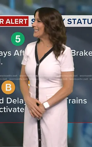 Heather O’Rourke on Good Morning America on ABC was spotted wearing this white contrast trim v-neck dress on Good Morning America on Jul 21 2025's episode. Heather's Dress is the Contrast Placket V-neck Button Down Mini Dress in Black/soft White by Karl Lagerfeld.
