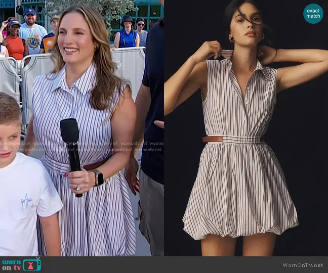 Maeve Belted Bubble-Hem Mini Shirt Dress in Brown Stripe worn by Jennifer Llamas on Today