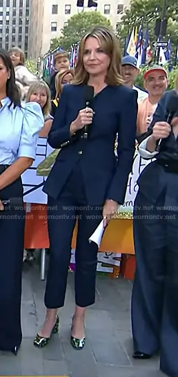 Savannah Guthrie on Today on NBC was spotted wearing this black floral print pumps on Today on Sep 15 2025's episode. Savannah's Shoes is the Flora Block Heel Pump by Prada.