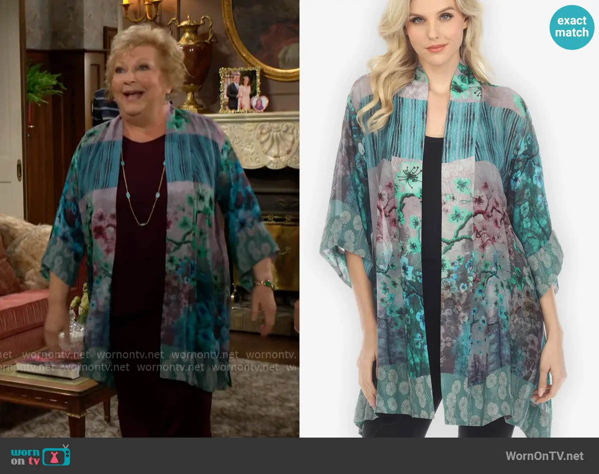 Traci Abbott (played by Beth Maitland) on The Young and the Restless on CBS was spotted wearing this blue mixed print kimono jacket on The Young and the Restless on May 27 2025's episode. Traci's Jacket is the Joy Bloom Border in Blue Kimono Jacket by Citron .