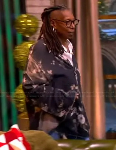Whoopi Goldberg on The View on ABC was spotted wearing this black floral print shirt on The View on Dec 09 2025's episode. Whoopi's Top is the Black Shredded Seam Drop Neck Shirt by R13.