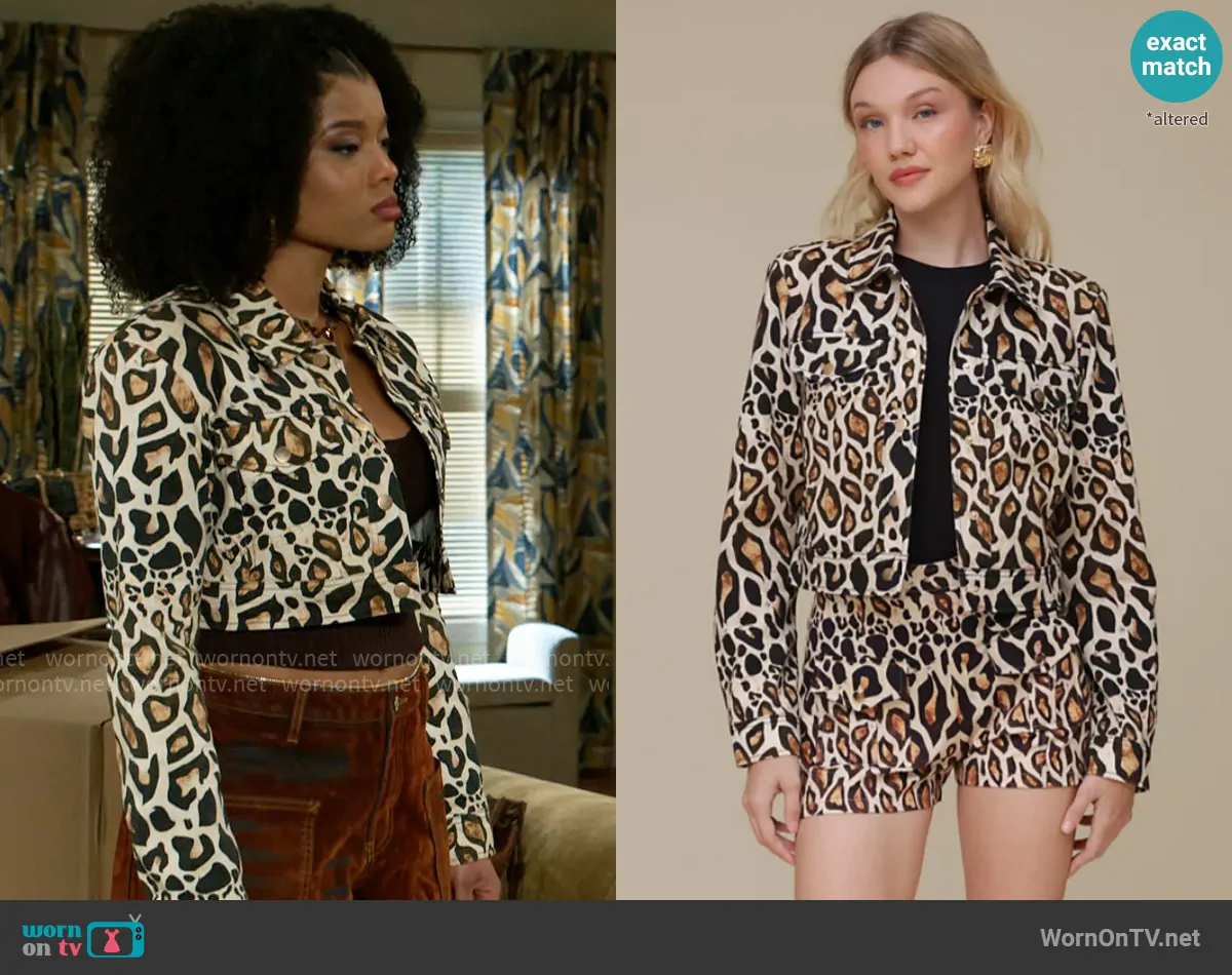 Eva Thomas (played by Ambyr Michelle) on Beyond the Gates on CBS was spotted wearing this cropped leopard print jacket and velvet pants on Beyond the Gates on May 30 2025's episode. Eva's Jacket is the Cotton Cropped Printed Jacket in Leopard by Avec Les Filles . Eva's Pants is the Valerie Velvet Effect Wide Leg Pant by Akira.