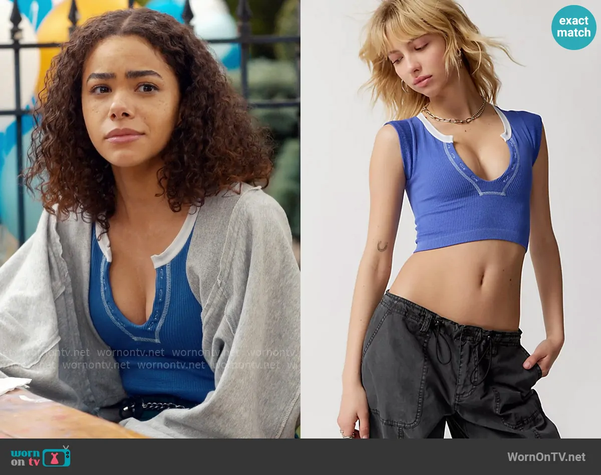Ginny Miller (played by Antonia Gentry) on Ginny & Georgia on Netflix was spotted wearing this blue split-neck crop top and grey sweatshirt on Ginny & Georgia on episode 'The Bitch Is Back' (3x04) in Jun 2025. Ginny's Top is the Go For Gold Top by Out From Under at Urban Outfitters . Ginny's Jacket is the Cropped Shrug Sweatshirt by American Eagle.