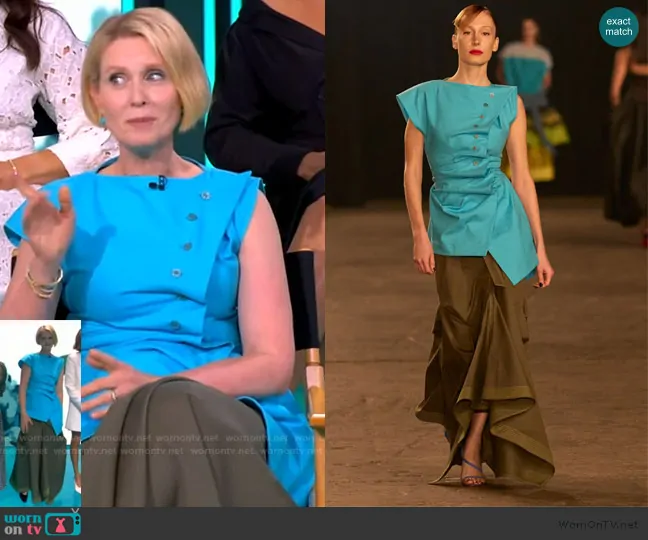 on The View on ABC was spotted wearing this blue peplum top and pants on The View on Jun 10 2025's episode. 's Set is the 2025 Fall Collection by Christopher John Rogers.