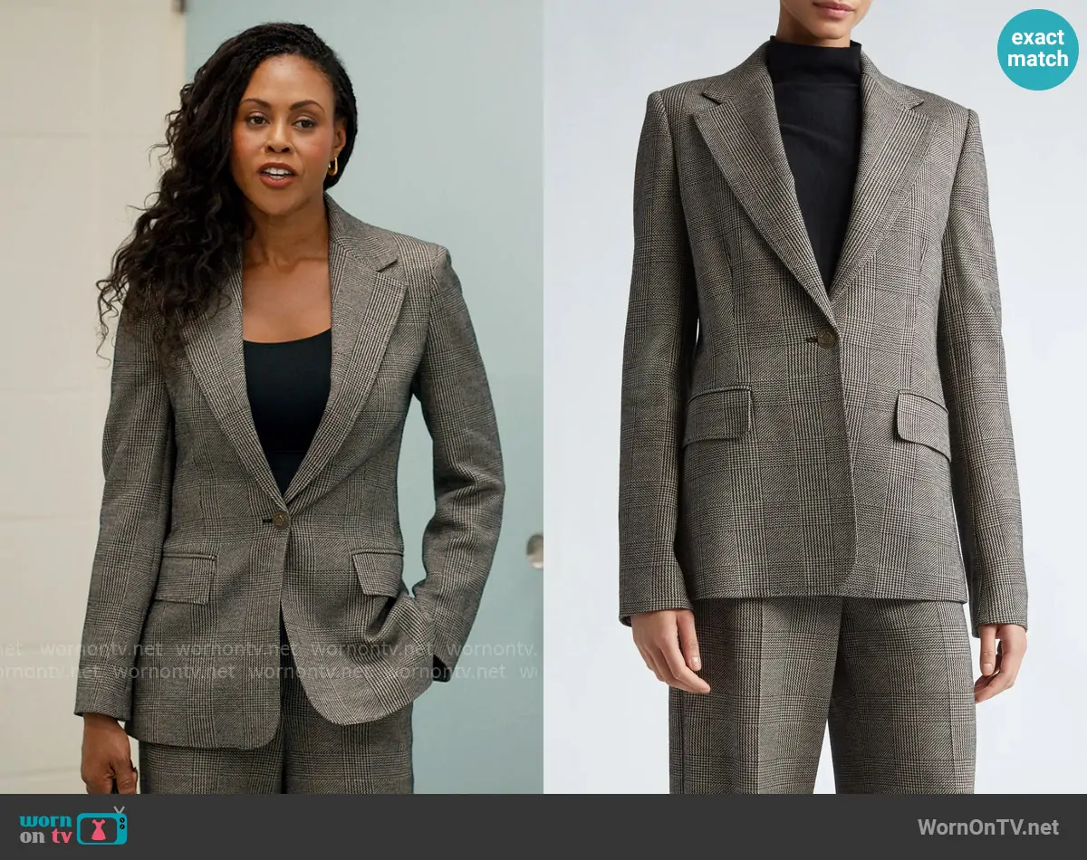 Ginny Miller (played by Antonia Gentry) on Ginny & Georgia on Netflix was spotted wearing this grey plaid suit on Ginny & Georgia on episode 'It's Time For My Solo' (3x09) in Jun 2025. Ginny's Jacket is the Muschio Houndstooth Wool Blend Blazer by Max Mara . Ginny's Pants is the Cognac Check Wide Leg Wool Blend Jersey Pants by Max Mara.