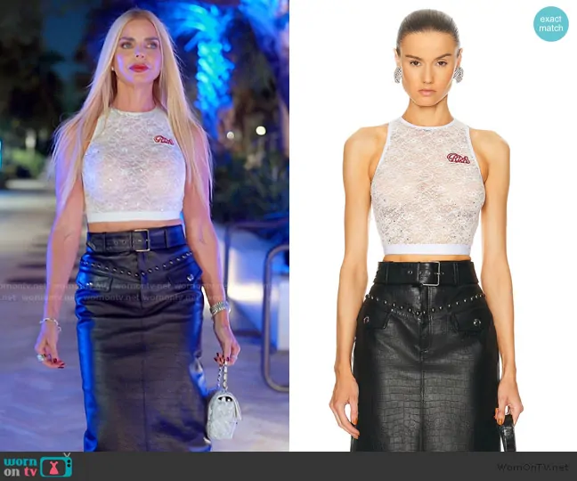 Alexia Echevarria (played by Alexia Echevarria) on The Real Housewives of Miami on Peacock was spotted wearing this white floral lace top and leather skirt on The Real Housewives of Miami on episode 'MIA Back in Action' (7x01) in Jun 2025. Alexia's Top is the Stretch Lace Sleeveless Top by Alessandra Rich . Alexia's Skirt is the Croco Print Leather Midi Skirt W/ Studs by Alessandra Rich.