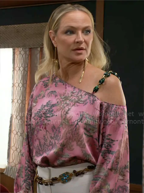Sharon Newman (played by Sharon Case) on The Young and the Restless on CBS was spotted wearing this pink printed asymmetric shoulder top on The Young and the Restless on Jun 16 2025's episode. Sharon's Top is the Asami Top by L'Agence . Sharon's Earrings is the Fringe-Detail Earrings by H&M . Sharon's Shoes is the Lilla Wedge Sandals in Egyptian Gold by Vince Camuto.