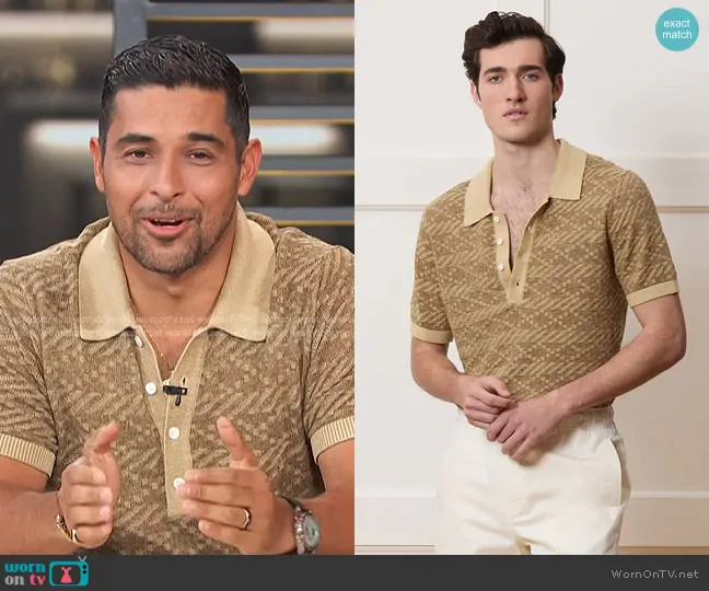 Todd Snyder Linen Sweater Polo in umber worn by Wilmer Valderrama on Access Hollywood