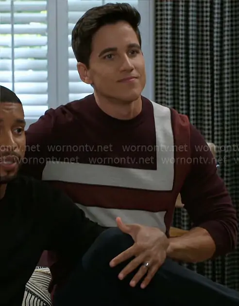 Bradley 'Smitty' Smith (played by Mike Manning) on Beyond the Gates on CBS was spotted wearing this burgundy colorblock sweater on Beyond the Gates on Oct 14 2025's episode. Smitty's Sweater is the Roika Sweater by Ted Baker.