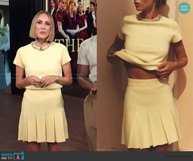 Keltie Knight on E! News on E! was spotted wearing this yellow embellished neckline top and skirt on E! News on Jun 17 2025's episode. Keltie's Top is the Jewel Knit Top by Zara . Keltie's Skirt is the Box Pleat Knit Mini Skirt by Zara.