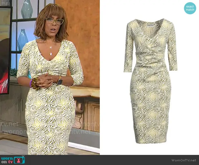 Gayle King on CBS Mornings on CBS was spotted wearing this yellow zebra print dress on CBS Mornings on Jun 17 2025's episode. Gayle's Dress is the Ruched Zebra-Print Bodycon Midi Dress by Chiara Boni La Petite Robe .