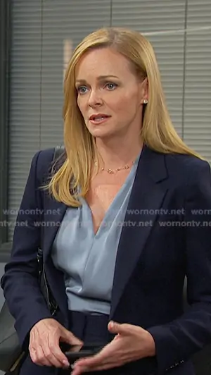 Belle Brady (played by Martha Madison) on Days of our Lives on Peacock was spotted wearing this blue v-neck blouse on Days of our Lives on Apr 09 2026's episode. Belle's Top is the Nanee Pleated Silk Blouse by Kobi Halperin.