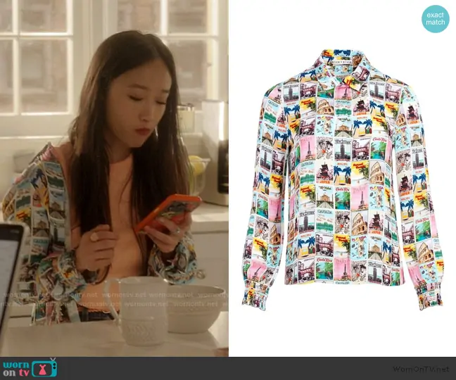 Lily Goldenblatt (played by Cathy Ang) on And Just Like That on HBO was spotted wearing this postcard print shirt on And Just Like That on episode 'Apples to Apples' (3x04) in Jun 2025. Lily's Top is the Willa Printed Shirt by Alice + Olivia.