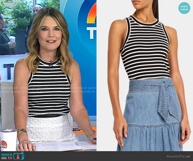 Savannah Guthrie on Today on NBC was spotted wearing this black striped top and white textured skirt on Today on Jun 20 2025's episode. Savannah's Top is the Jordyn Cropped Tank Top in White/Black by Veronica Beard . Savannah's Skirt is the Embroidered Eyelet Midi-Skirt by Lela Rose.