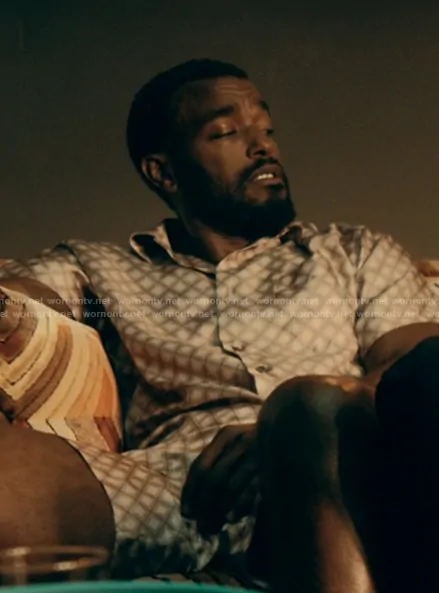 Trig (played by Luke James) on The Chi on ShowTime was spotted wearing this geometric print shirt and shorts on The Chi on episode 'More Life' (7x03) in Jun 2025. Trig's Shirt is the Geometric Print Short Sleeve Silk Button-Up Shirt by John Elliott . Trig's Shorts is the Geometric Print Silk Shorts by John Elliott.