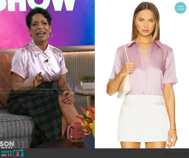 on The Kelly Clarkson Show on NBC was spotted wearing this violet satin shirt and skirt on The Kelly Clarkson Show on Jun 24 2025's episode. 's Top is the Ellah Short Sleeve Blouse by L'Agence . 's Skirt is the The Amara Skirt - Knit Suiting by M.M. LAfleur.