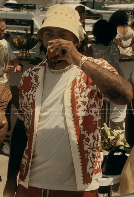 Knuck (played by Cortez Smith) on The Chi on ShowTime was spotted wearing this red floral print shirt on The Chi on episode 'Safe Harbor' (7x05) in Jun 2025. 's Shirt is the Red Dragonflower Print Relaxed Fit Capri Collar Shirt by Orlebar Brown . 's Hat is the Logo Cotton Gabardine Bucket Hat by Marni.