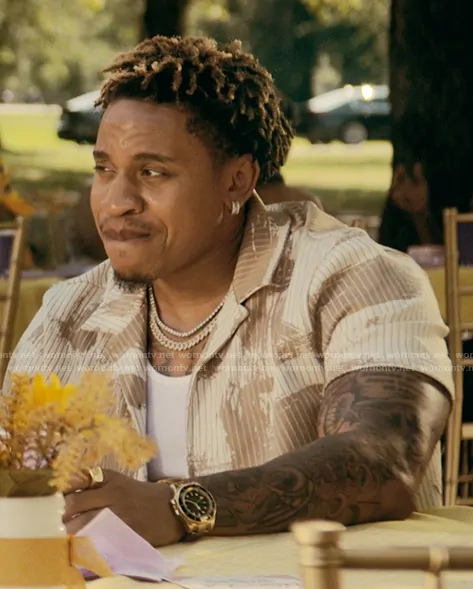 Charles (played by Rotimi) on The Chi on ShowTime was spotted wearing this printed ribbed shirt on The Chi on Jan 03 2024's episode. 's Shirt is the Viceroy Brushtroke Cuban Shirt by Reiss.