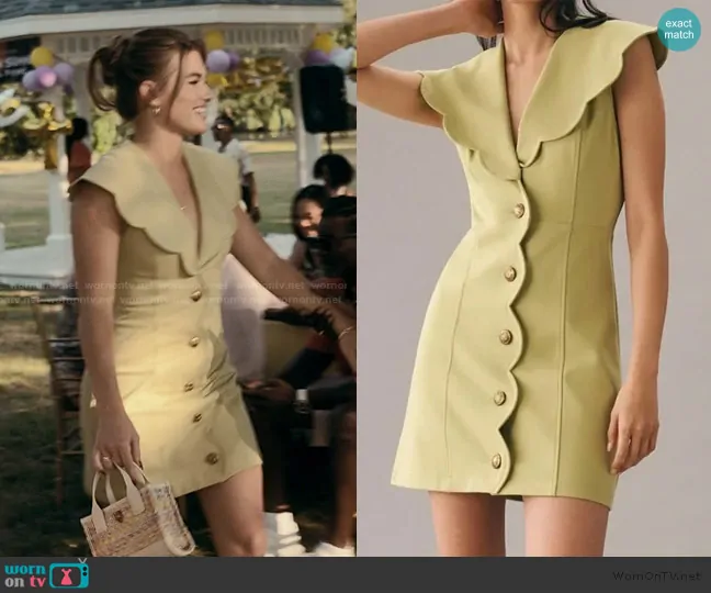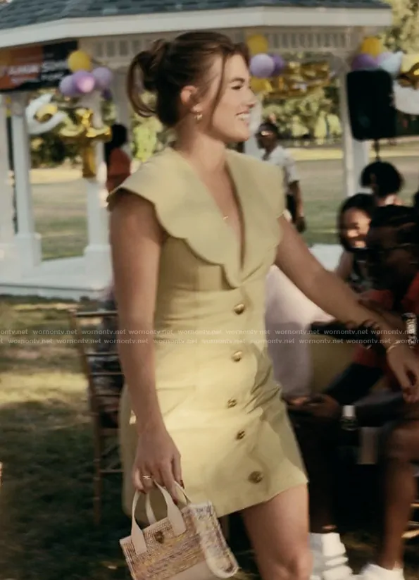 Sarah (played by Conner Ann Waterman) on The Chi on ShowTime was spotted wearing this scalloped mini dress on The Chi on Jan 03 2024's episode. 's Dress is the Scalloped Buttondown Dress by Maeve . 's Bag is the XS Raffia Shapper Tote by Maeve.