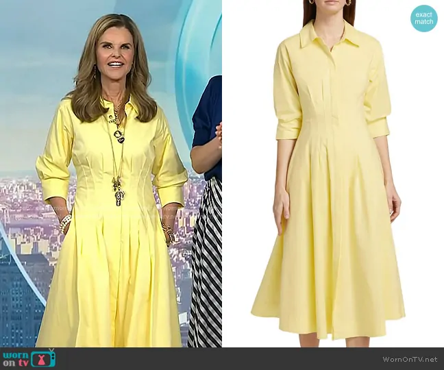 Maria Shriver on Today on NBC was spotted wearing this yellow shirtdress on Today on Jun 26 2025's episode. Maria's Dress is the Jazz Pintucked Midi Shirtdress in Buttercream by Simkhai.