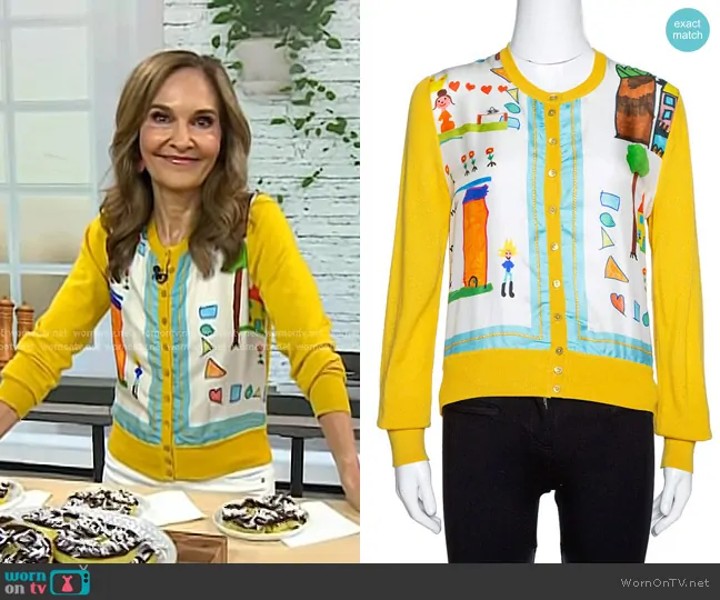 Joy Bauer on Today on NBC was spotted wearing this yellow graphic print cardigan on Today on Jun 27 2025's episode. Joy's Sweater is the Printed Silk & Cashmere Knit Cardigan in Yellow by Dolce & Gabbana.