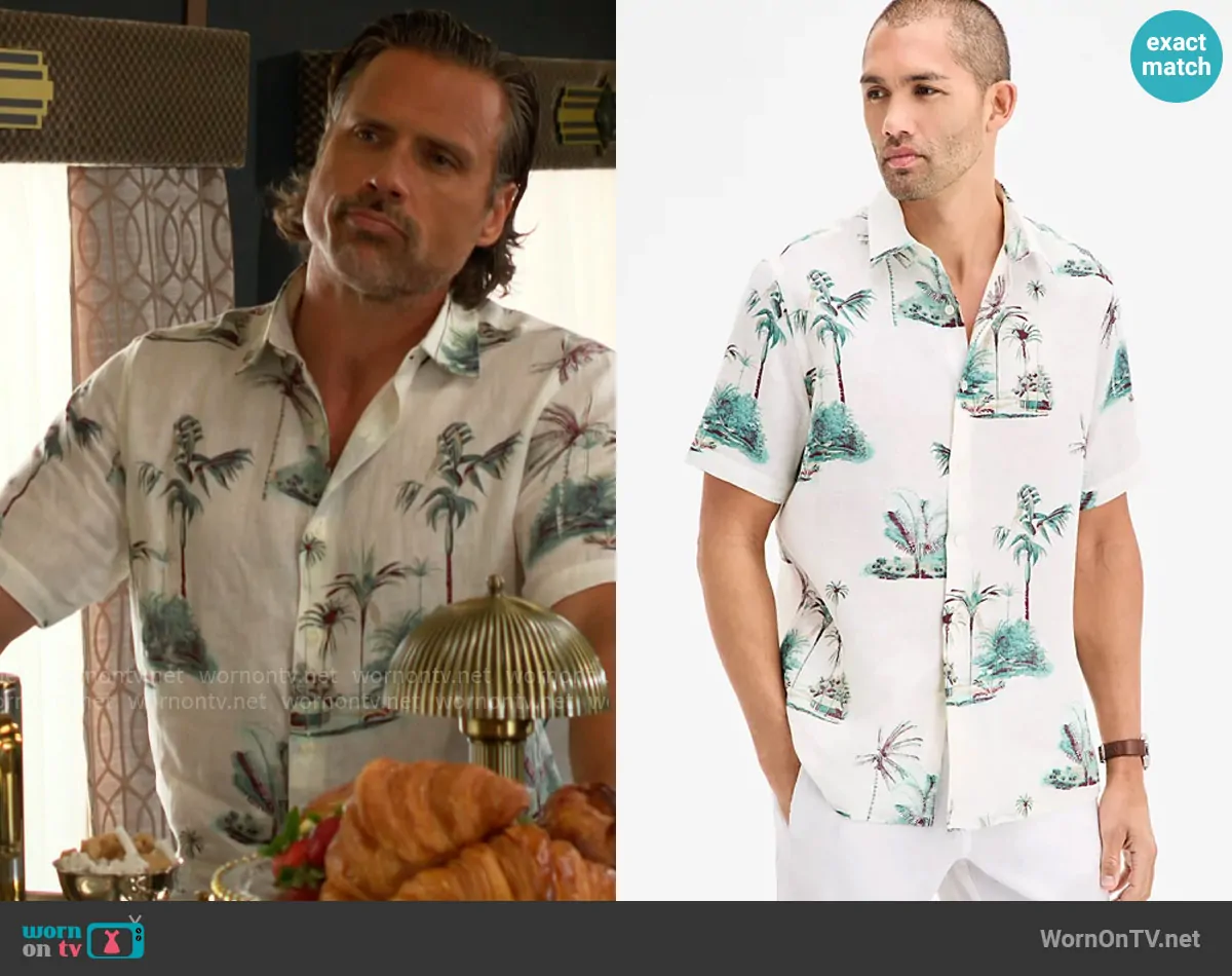 Nick Newman (played by Joshua Morrow) on The Young and the Restless on CBS was spotted wearing this palm tree shirt on The Young and the Restless on Jun 29 2025's episode. Nick's Shirt is the Aloha Short Sleeved Tropical Print Button-Front Linen Shirt by Club Room .