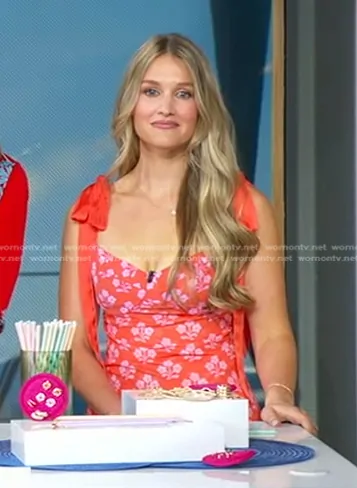 on Good Morning America on ABC was spotted wearing this coral pink floral dress on Good Morning America on Jun 30 2025's episode. 's Dress is the Floral Layered Mesh Slipdress in Coral Combo by Free People.
