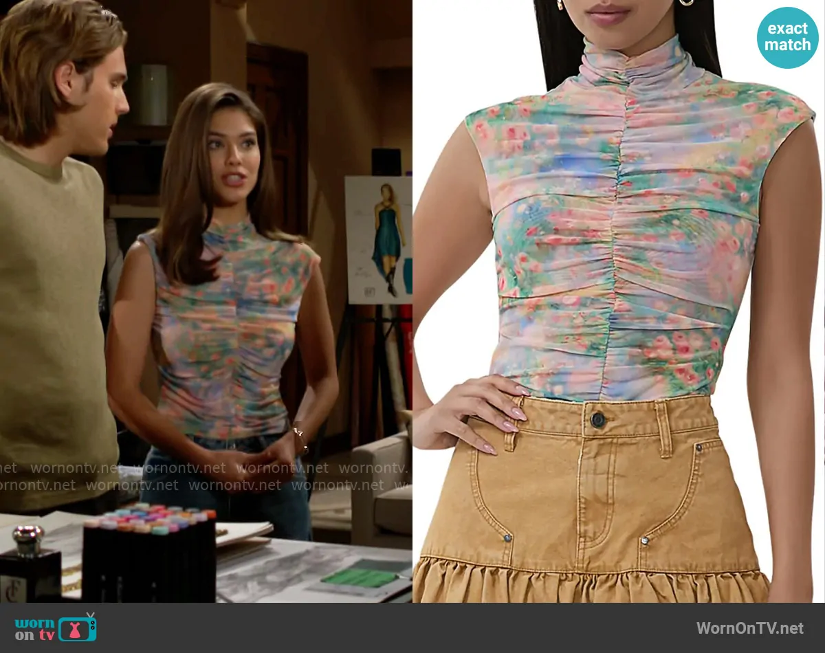 Electra Forrester (played by Laneya Grace) on The Bold and the Beautiful on CBS was spotted wearing this printed ruched top on The Bold and the Beautiful on Jul 01 2025's episode. Electra's Top is the Jolie Top in Fog Field by AFRM .