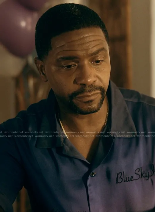 (played by ) on The Chi on ShowTime was spotted wearing this printed ombre shirt on The Chi on Jan 04 2024's episode. 's Shirt is the Palm tree-print ombre shirt by Blue Sky Inn.