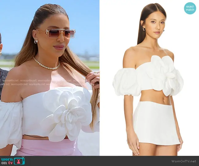 Larsa Pippen (played by Larsa Pippen) on The Real Housewives of Miami on Peacock was spotted wearing this white floral applique crop top on The Real Housewives of Miami on episode 'Boogers and Birkins' (7x04) in Jul 2025. Larsa's Top is the Keira Top by Yumi Kim . Larsa's Sunglasses is the On What Grounds Sunglasses in Brown by Fashion Nova.