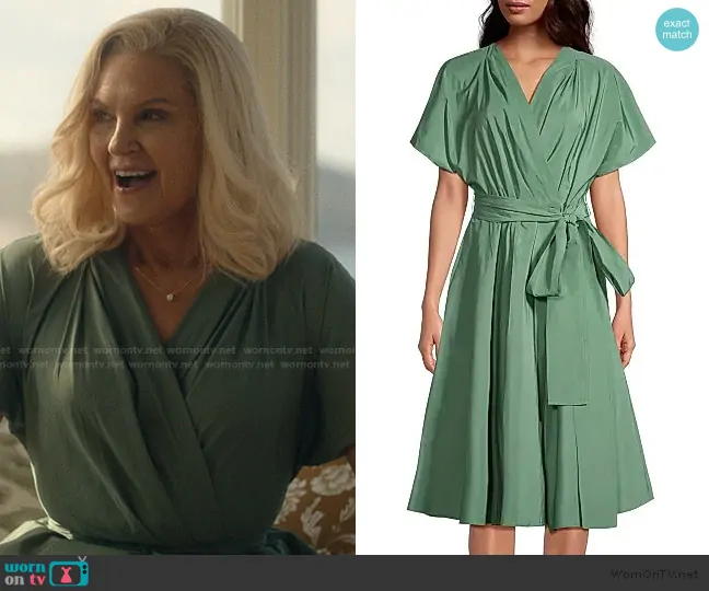 Tipper (played by Wendy Crewson) on We Were Liars on Amazon Prime was spotted wearing this green wrap dress on We Were Liars on episode 'The Ties Were Black, The Lies Were White' (1x03) in Jul 2025. 's Dress is the Giambo Surplice Satin Fit & Flare Dress by Weekend Max Mara.