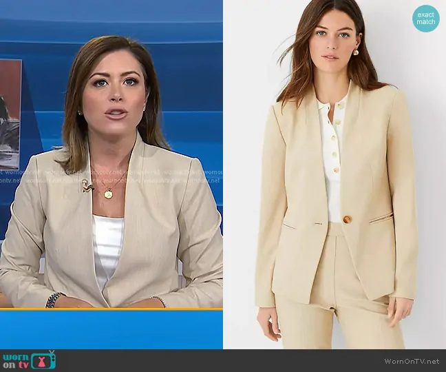 Chloe Melas on Today on NBC was spotted wearing this beige collarless blazer on Today on Jul 03 2025's episode. Chloe's Jacket is the The Cutaway Blazer in Bi-Stretch Toasted Oat by Ann Taylor.