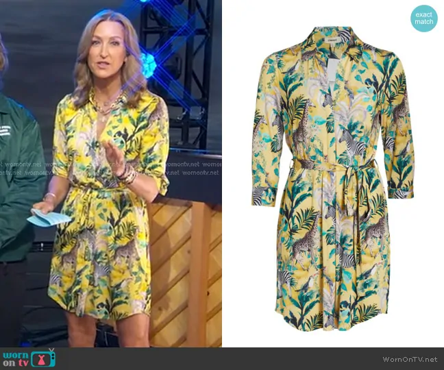 Lara Spencer on Good Morning America on ABC was spotted wearing this yellow animal print shirtdress on Good Morning America on Jul 07 2025's episode. Lara's Dress is the Addison Shirtdress in Light Maize Multi Animal Jungle by L'Agence.