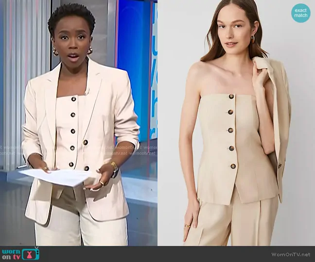 Zinhle Essamuah on NBC News Daily on NBC was spotted wearing this beige strapless vest and blazer on NBC News Daily on Sep 16 2025's episode. Zinhle's Vest is the Strapless Vest in Sands Edge by Ann Taylor . Zinhle's Jacket is the The Greenwich Blazer in Sands Edge by Ann Taylor . Zinhle's Pants is the The Belted Wide-Leg Pant in Twill in Sands Edge by Ann Taylor.
