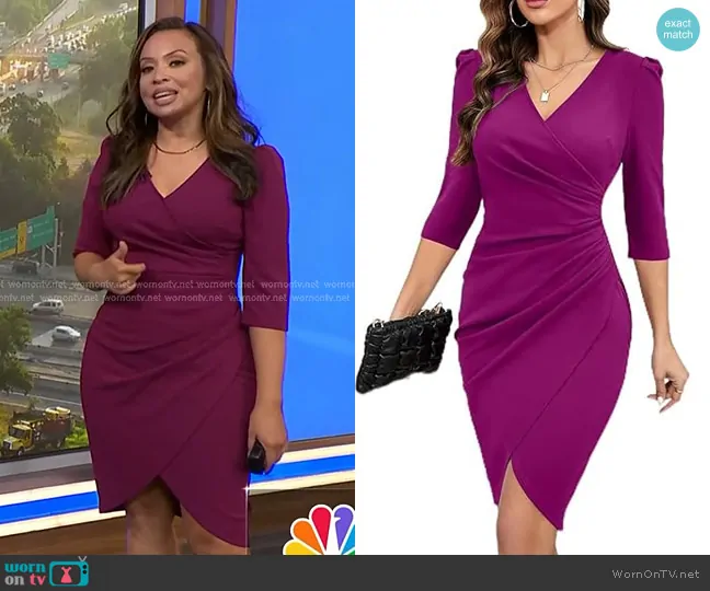 Adelle Caballero on Today on NBC was spotted wearing this purple wrap sheath dress on Today on Jul 08 2025's episode. Adelle's Dress is the Faux Wrap Ruched Sheath by Ihot at Amazon.